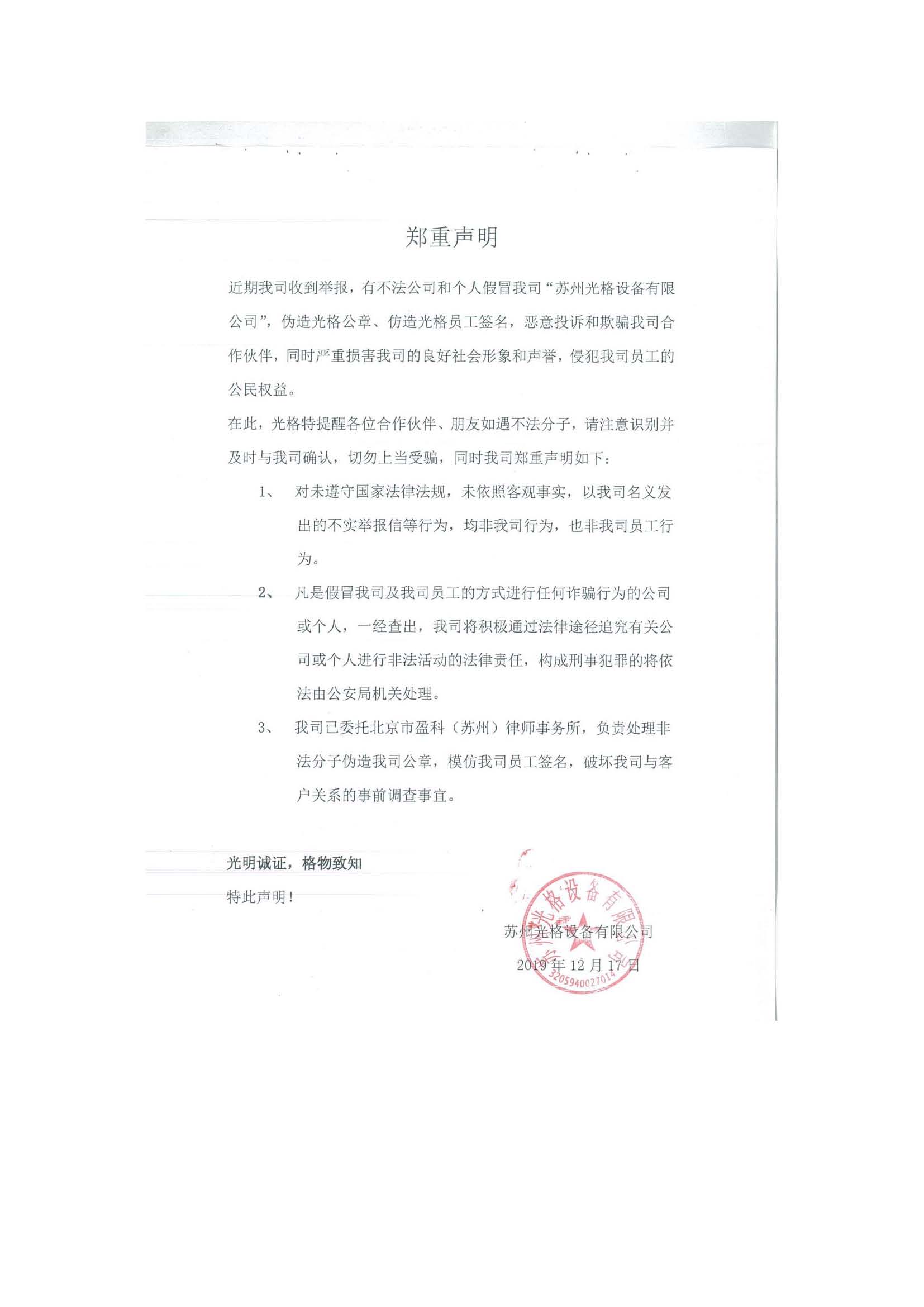 近期我司收到舉報(bào),有不法公司和個(gè)人假冒我公司“蘇州光格設(shè)備有限公司”名義,偽造光格公章,仿造光格員工簽名,惡意投訴和欺騙我司合作伙伴,同時(shí)嚴(yán)重?fù)p害我司的良好社會形象和聲譽(yù),侵犯我司員工的公民權(quán)益。