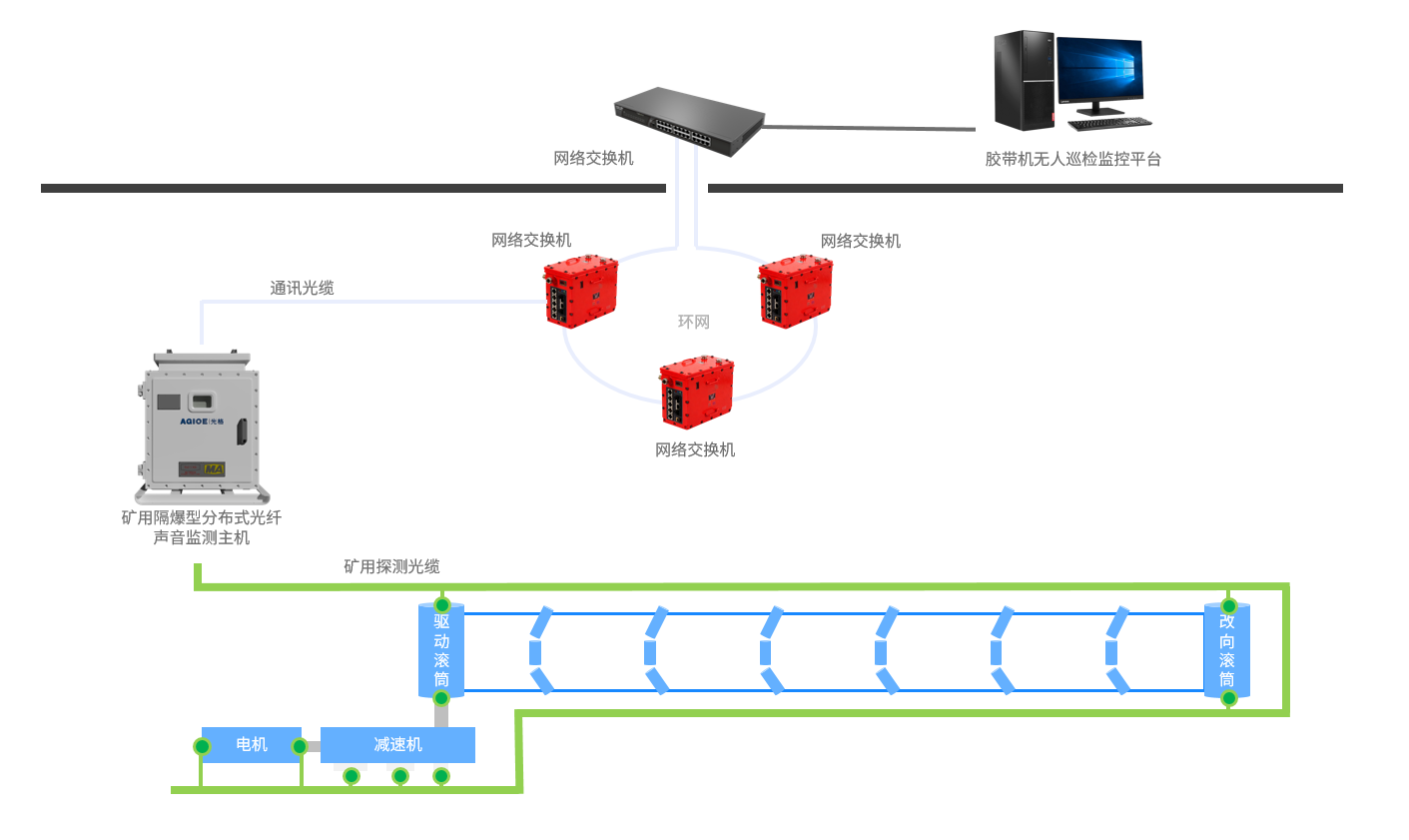 膠帶機(jī)振動監(jiān)測系統(tǒng)以分布式光纖振動與聲學(xué)傳感技術(shù)為核心,通過在膠帶機(jī)兩側(cè)敷設(shè)探測光纜,對托輥、驅(qū)動裝置、轉(zhuǎn)接料斗等關(guān)鍵設(shè)施實現(xiàn)運(yùn)行狀態(tài)連續(xù)感知與智能診斷,為煤礦行業(yè)無人化巡檢落地及主動安全防控體系構(gòu)建提供核心技術(shù)支撐。